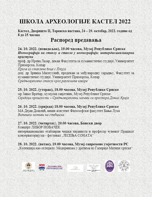 Друштво археолога Републике Српске у сарадњи са Музејом Републике Српске, Филозофским факултетом Универзитета у Бањој Луци и Филозофским факултетом Универзитета Источно Сарајево, те уз сагласност Републичког завода за заштиту културно – историјског и природног насљеђа Републике Српске, реализоваће пројекат „Школа археологије – Кастел 2022“ у периоду од 24. до 29. октобра.
