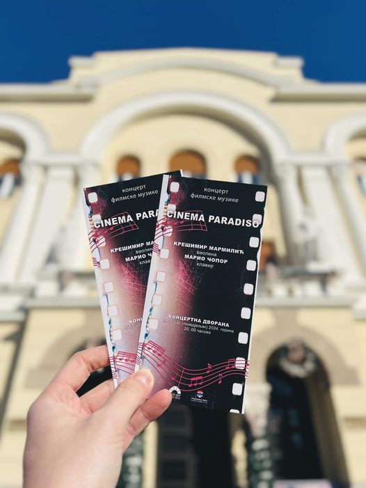 У Концертној дворани Културног центра Бански двор у понедјељак, 29. јануара у 20.00 часова, биће одржан концерт филмске музике „Cinema Paradiso“ у извођењу виртуозног клавира и чаробне виолине -Крешимир Мармилић – виолина и Марио Чопор – клавир.