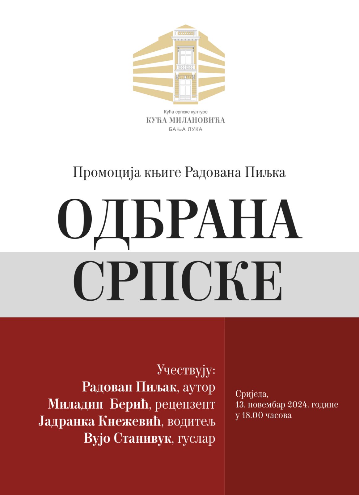 Naime, za 13. novembar sa početkom u 18.00 časova zakazana je promocija knjige Radovana Piljka pod nazivom „Odbrana Srpske“. Uz autora, na promociji će učestvovati i: recenzent Miladin Berić, voditelj Jadranka Knežević i guslar Vuko Stanivuk.