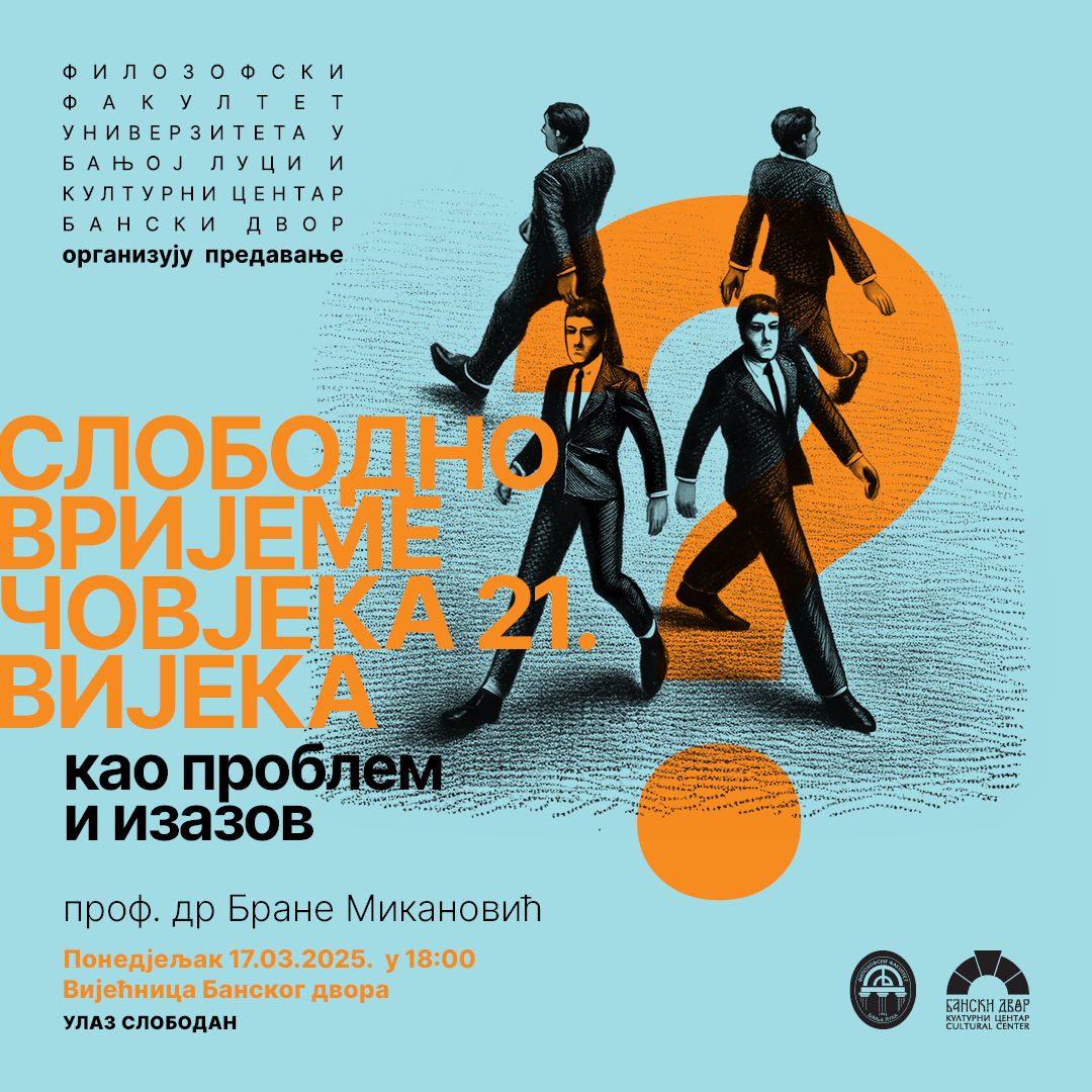 Предавање на тему Слободно вријеме човјека 21. вијека као проблем и изазов редовног професора са Катедре за педагогију Филозофског факултета Универзитета у Бањој Луци проф. др Бране Микановића биће одржано у понедјељак, 17. марта у Вијећници Банског двора са почетком у 18.00 часова.