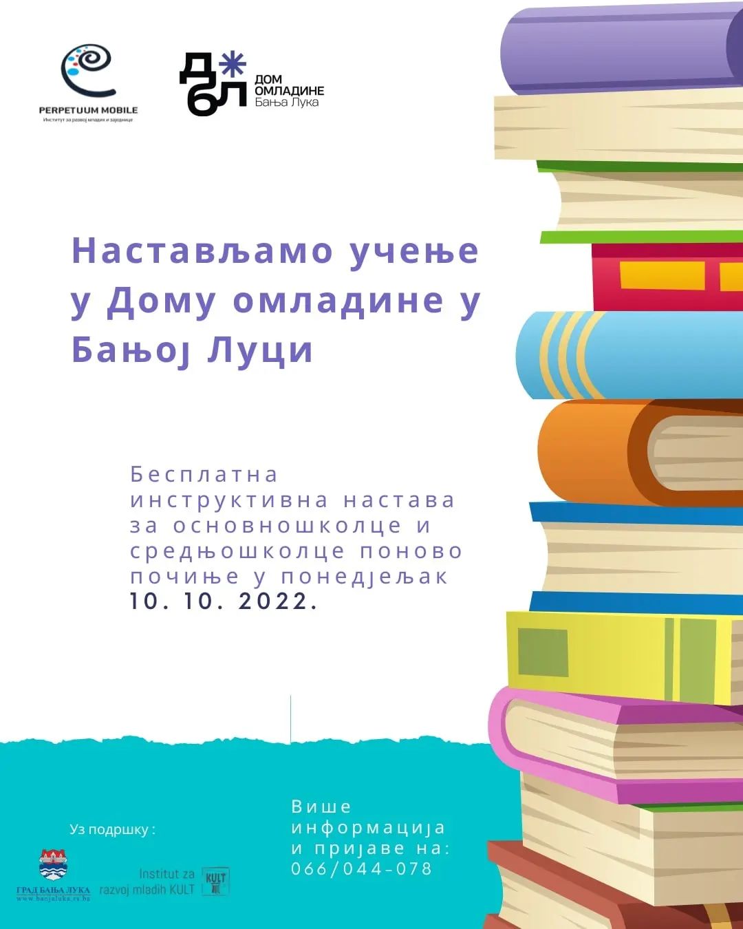 Besplatna instruktivna nastava u Domu omladine, koju realizuje Perpetum mobile – Institut za razvoj mladih i zajednice Banja Luka, biće nastavljena i u toku ove školske godine.