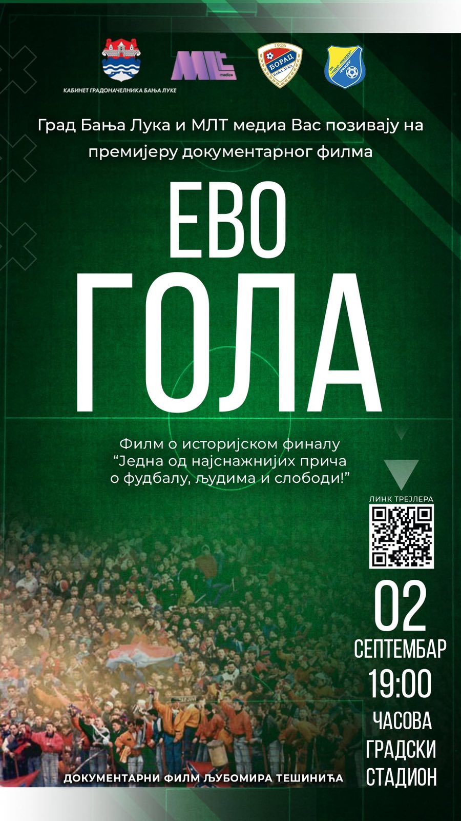 Premijera dokumentarnog filma „Evo gola“ producenta i scenariste Ljubomira Tešinića biće održana u ponedjeljak, 2. septembra sa početkom u 19.00 časova na Gradskom stadionu u Banjoj Luci.