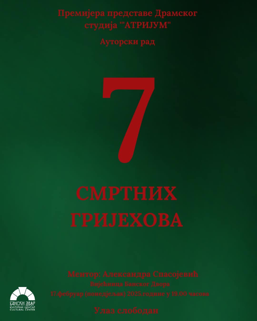 U Vijećnici Kulturnog centra Banski dvor u ponedjeljak, 17. februara u 19.30 časova Dramski studio “Atrijum” izvešće premijeru predstave “Sedam smrtnih grijehova”, autorski rad članova starije grupe studija „Atrijum“.