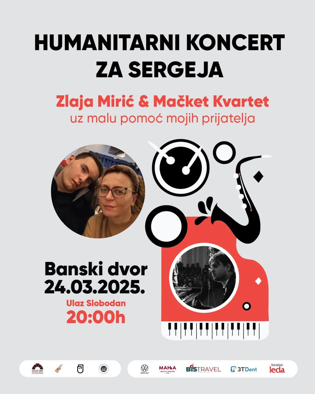 Улаз на концерт је бесплатан, а у дворани ће бити постављене хуманитарне кутије, у које ће грађани моћи да донирају средства за наставак лијечења нашег суграђанина Сергеја Ступара у Москви.