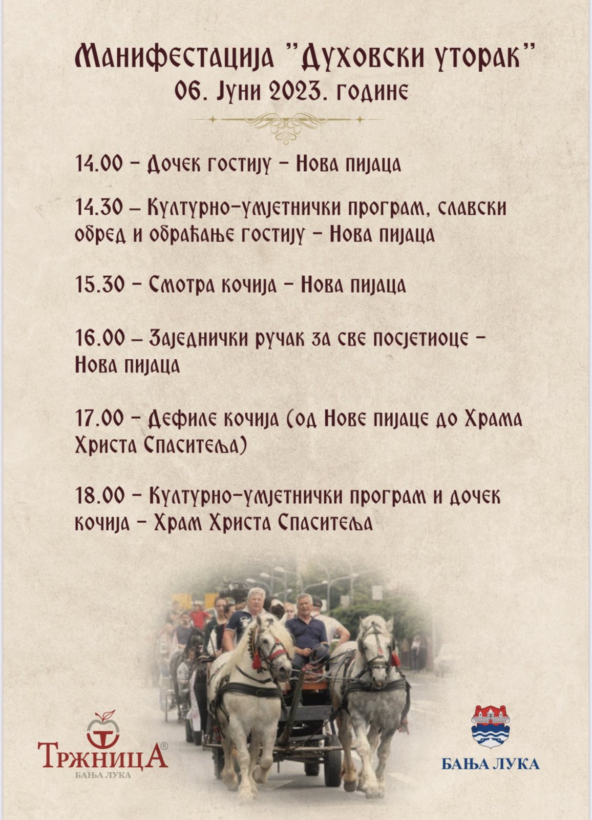 Osim slavskog obreda, prigodnog programa i slavskog ručka, koji će biti upriličen na Novoj pijaci od 14.00 časova, na ovoj lokaciji biće organizovana i smotra kočija, kao i izbor pobjednika u sljedećim kategorijama: najljepši fijaker, najljepši komplet i najljepša tradicionalna konjska zaprega.