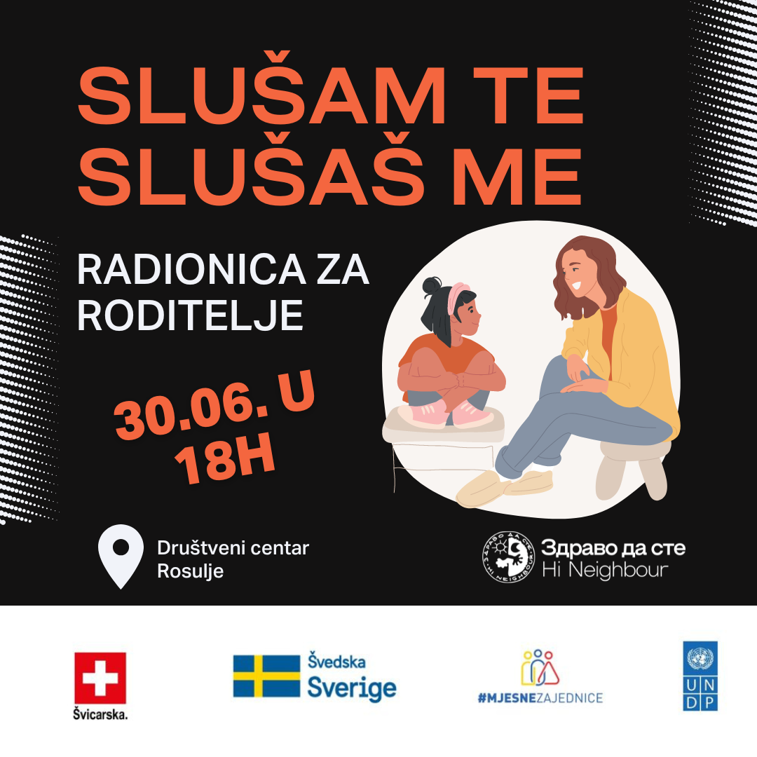 Радионица за родитеље под називом „Слушаш ме, слушам те“ биће одржана, сутра, 30. јуна са почетком у 18.00 часова у просторијама Друштвеног центра Росуље – Парк „Младен Стојановић“.