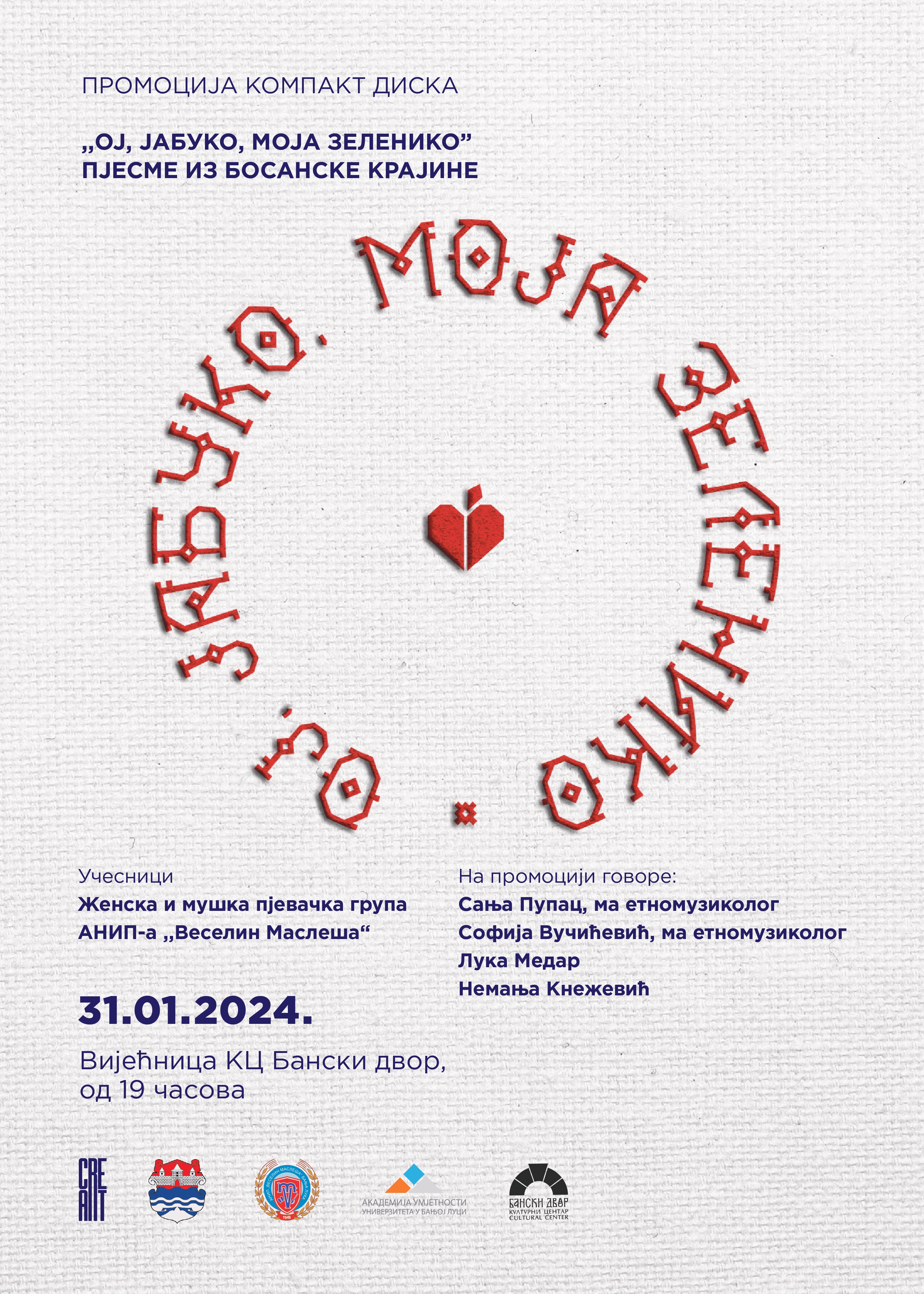 U Vijećnici Kulturnog centra Banski dvor u srijedu, 31. januara biće održana promocija kompakt diska ,,Oj, jabuko, moja zeleniko” pjesme iz Bosanske krajine sa početkom od 19.00 časova.