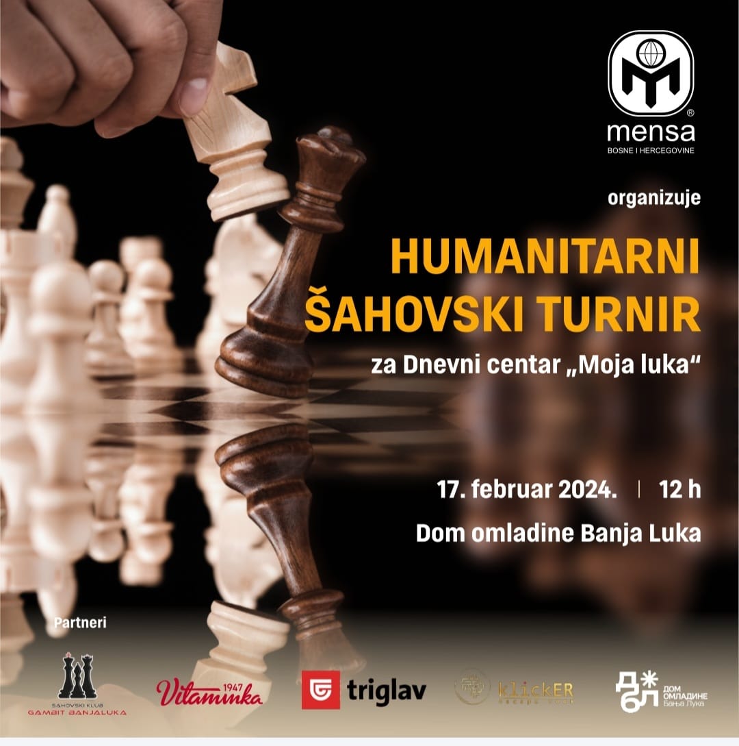 Менса Босне и Херцеговине организује хуманитарни шаховски турнир у суботу, 17. фебруара од 12.00 часова у Дому Омладине у Бањој Луци.