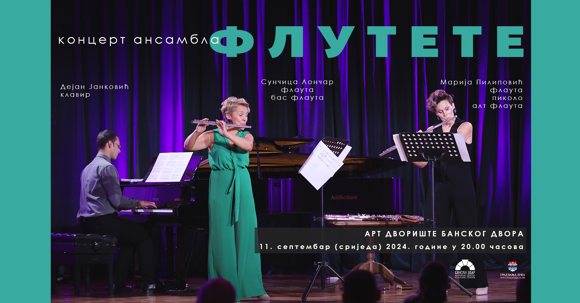 U Art dvorištu Kulturnog centra Bansi dvor, u srijedu 10. septembra 2024. godine u 20.00 časova biće održan koncert ansambla „Flutete“ kojeg čine muzički umjetnici Marija Pilipović – flauta, pikolo i alt flauta, Sunčica Lončar – flauta, bas flauta i Dejan Janković – klavir.