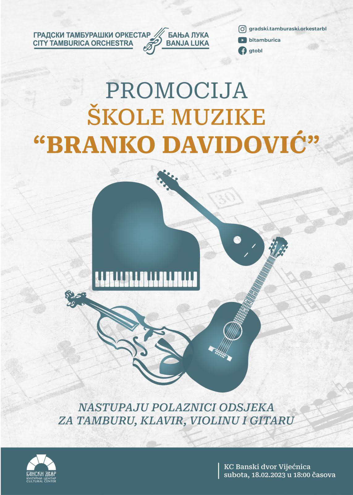 Promocija Škole muzike „Branko Davidović“ biće održana u subotu, 18. februara u 18.00 časova u Vijećnici Banskog dvora.