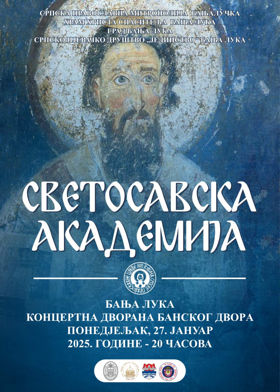 U čast Svetom Savi, prvom srpskom arhiepiskopu, učitelju i prosvjetitelju, večeras (ponedjeljak) u Koncertnoj dvorani Kulturnog centra Banski dvor sa početkom u 20.00 časova biće održana Svetosavska akademija.