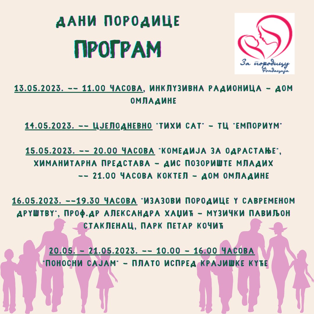 Fondacija „Za porodicu“ u susret Međunarodnom danu porodice, koji se obilježava 15. maja, organizuje niz zanimljivih događaja koji će trajati od subote, 13. pa sve do 21.maja.