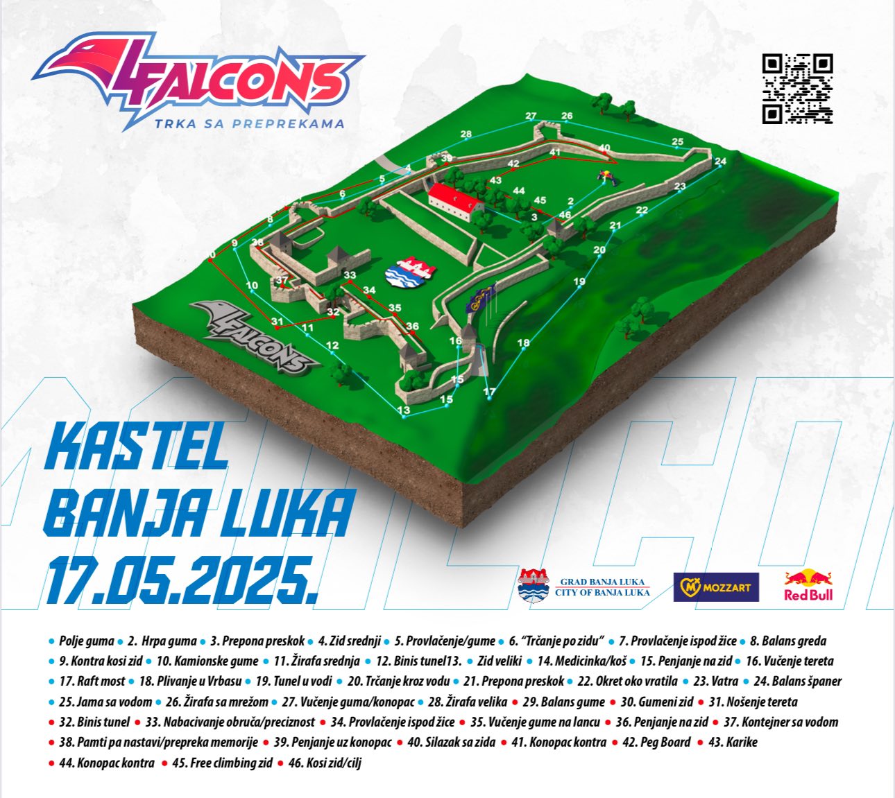 -Trka sa preprekama „4Falcons“ nastaje kao potreba da se u gradu Banjoj Luci, koja je na konstantnom putu da se vrati, integriše i pozicionira na mapu gradova sporta i mladosti, organizuje jedna ovakva sportska manifestacija u periodu kada Banja Luka proslavlja dan grada. Cilj trke jeste da privuče ogroman broj posjetilaca i da se grad Banja Luka mapira na kartu trenutno najpopularnijih vrsta trka u svijetu i regionu – navode organizatori.