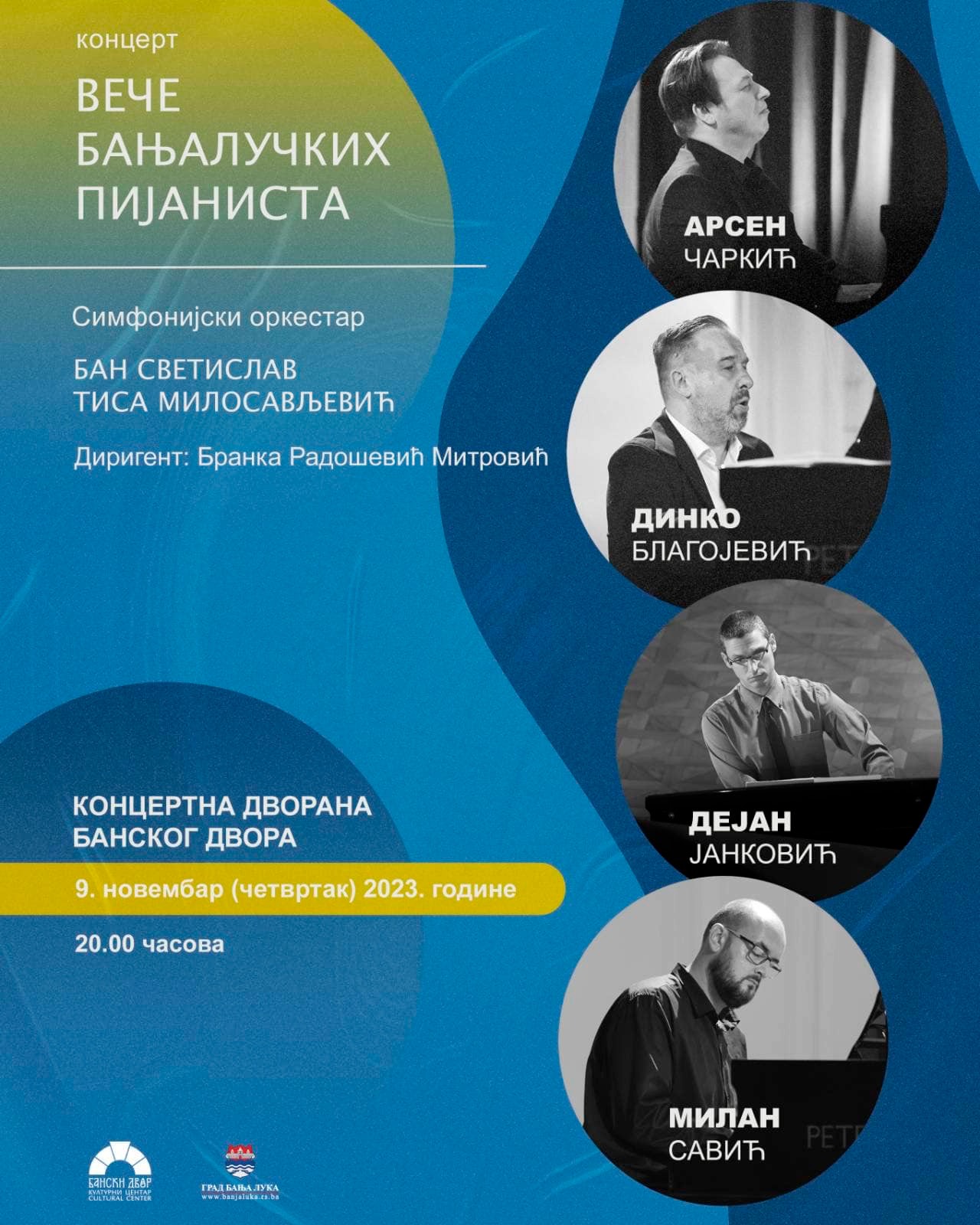 U okviru programa proslave i obilježavanja Dana Banskog dvora, u četvrtak, 9. novembra sa početkom u 20.00 časova, biće održan koncert „Veče banjalučkih pijanista“ na kojem će zajedno sa simfonijskim orkestrom „Ban Stvetislav Tisa Milosavljević“ i pod dirigentskom palicom Branke Radošević Mitrović, nastupiti četvorica istaknutih pijanista – Arsen Čarkić, RSEN ČARKIĆ, Dinko Blagojević,  Dejan Janković i Milan Savić.