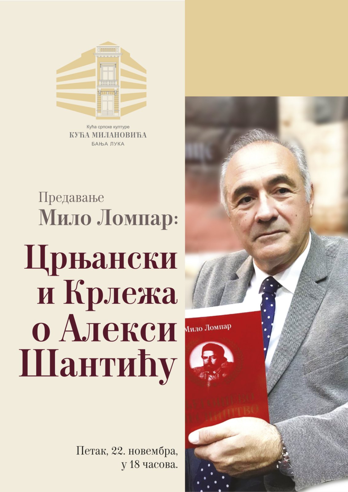 Професор др Мило Ломпар одржаће предавање о теми „Црњански и Крлежа о Алекси Шантићу“ у петак, 22. новембра у Кући Милановића.
