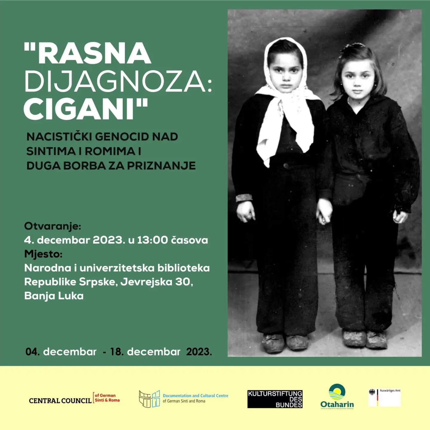 Izložba pod nazivom „Rasna dijagnoza: Cigani“ – nacistički genocid nad Sintima i Romima i duga borba za priznanje“ biće održana u ponedjeljak, 4. decembra u  Narodnoj i univerzitetskoj biblioteci Republike Srpske sa početkom u 13.00 časova.