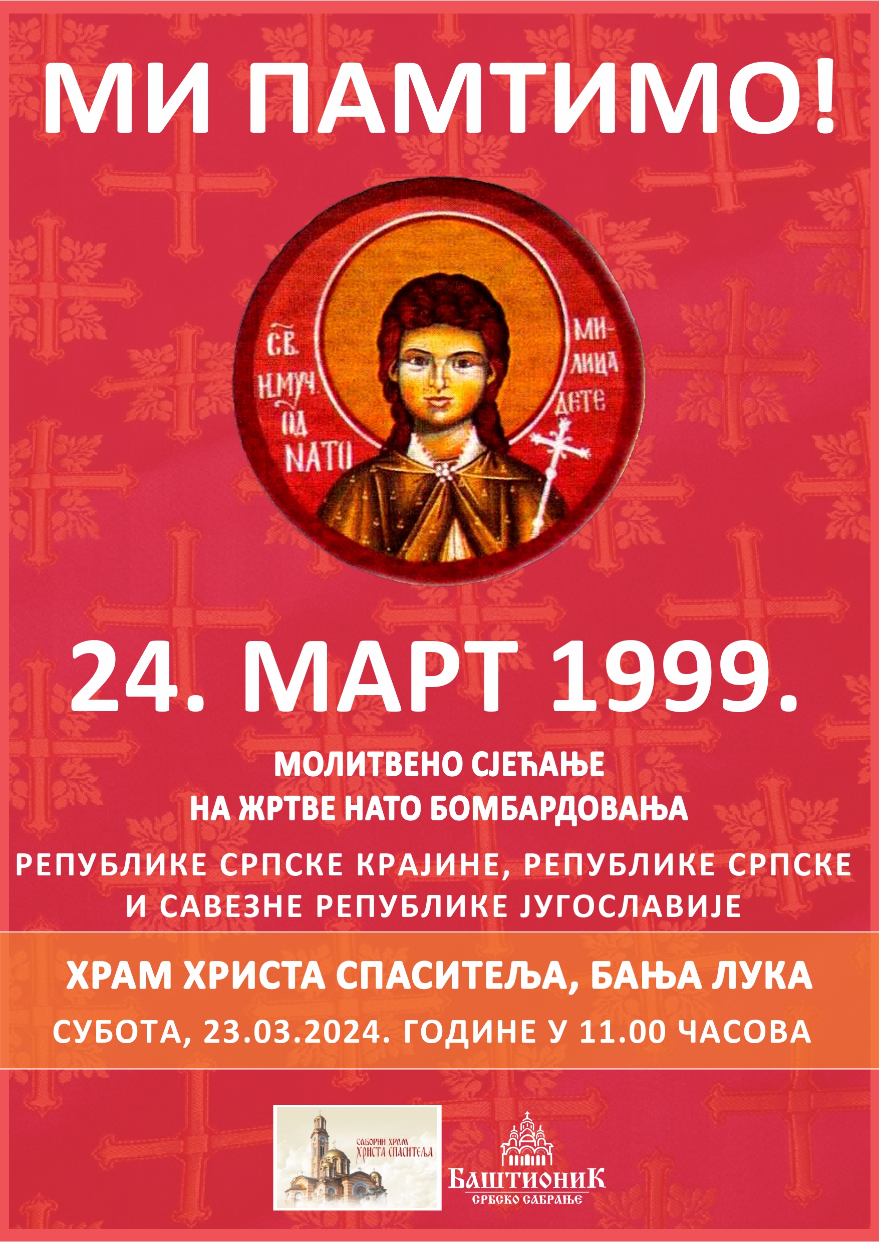 Takođe, sutra, 23. marta u 11.00 časova u Hramu Hrista Spasitelja biće služeno molitveno sjećanje – parastos za žrtve NATO bombardovanja, nakon čega će uslijediti i simbolična šetnja do Spomenika 12 banjalučkih beba.
