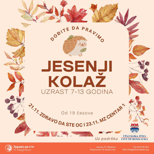 Удружење грађана „Здраво да сте“ организује занимљиву радионицу под називом „Јесењи колаж“, која је предвиђена за дјецу узраста од 7 до 13 година.