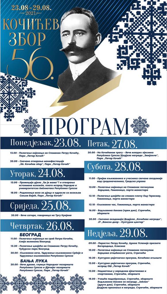 Наиме, 56. Кочићев збор биће одржан од 23. до 29. августа на три локације – у Бањој Луци, Стричићима и Београду.