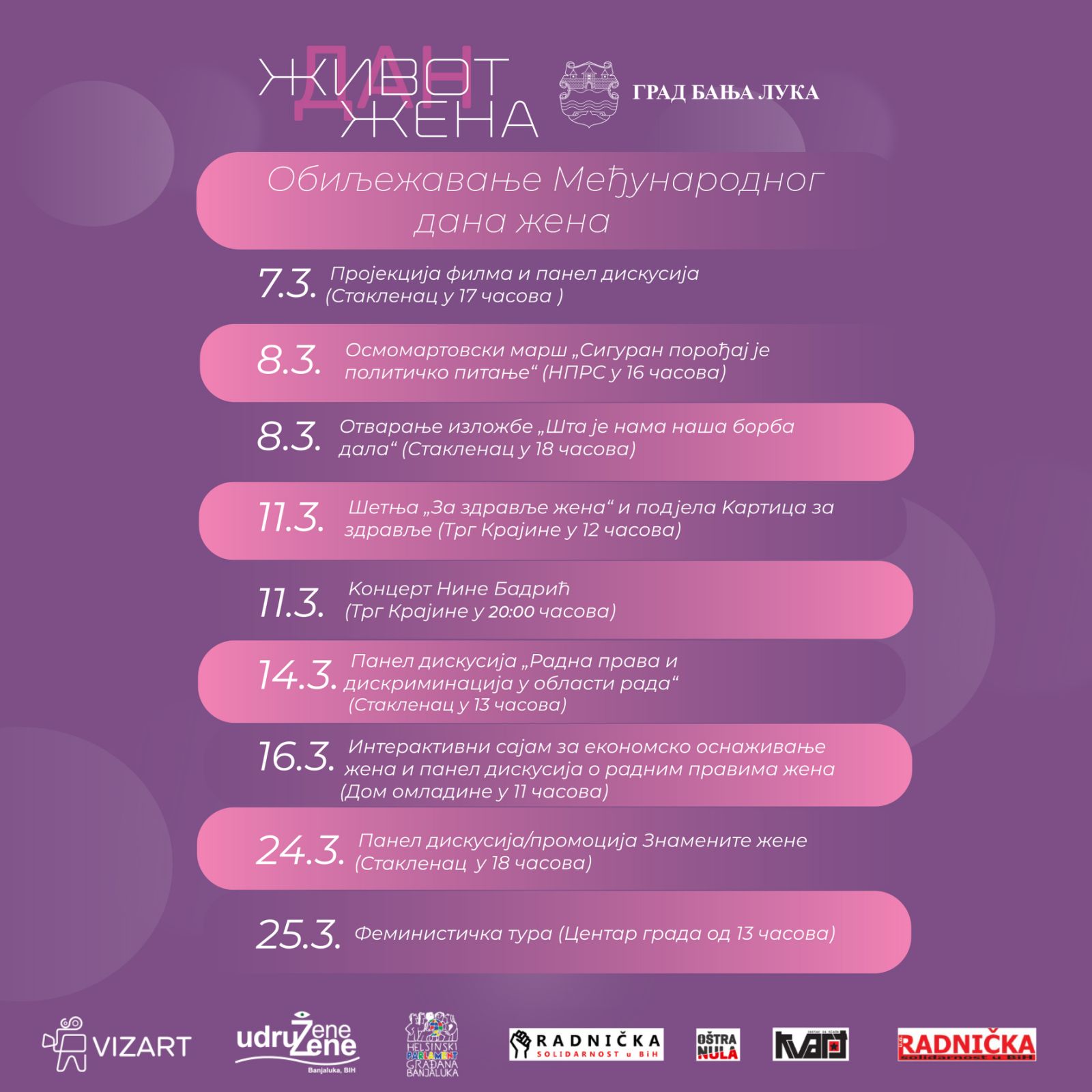 Богат осмомартовски програм уз подршку Града Бање Луке припремиле су невладине организације: Оштра Нула, Удружене жене, Хелсиншки парламент грађана Бања Лука, Радничка солидарност БиХ, VizArt и Центар за младе „Кварт“.
