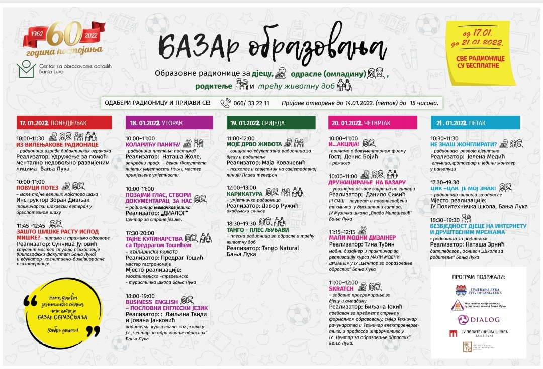 Besplatne obrazovne radionice za sve uzraste biće organizovane u okviru projekta „Bazar obrazovanja“, koji će biti održan od 17. do 21. januara u Centru za obrazovanje odraslih, a prijave za  učešće su u toku i traju do 14. januara.