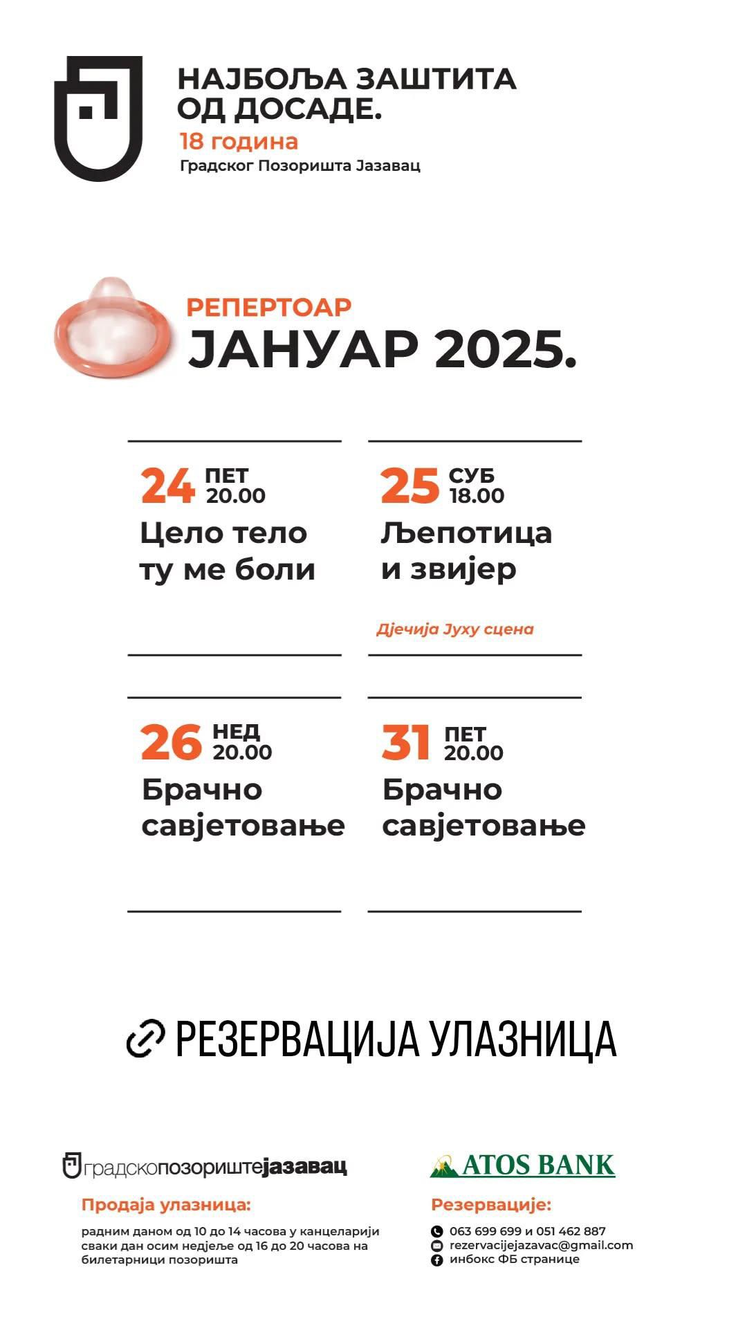 Naime, u petak 24. januara od 20.00 časova sve ljubitelje pozorišta očekuje predstava „Celo telo tu me boli“, dok će naredni dan, subota 25. januar od 20.00 časova biti odigrana predstava „Ljepotica i zvijer“.